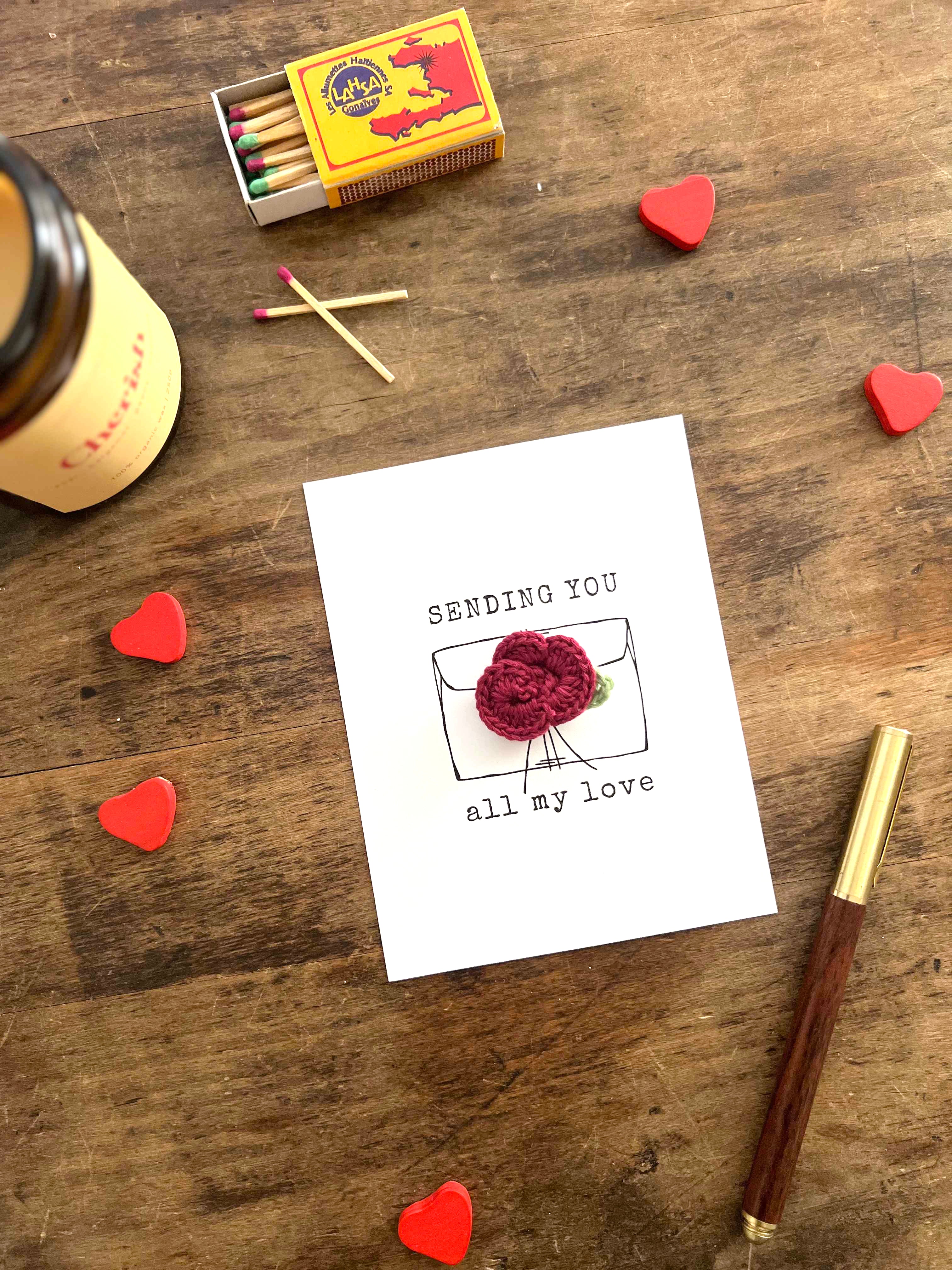 - Includes: Natural white cardstock, Hand-crocheted Pin